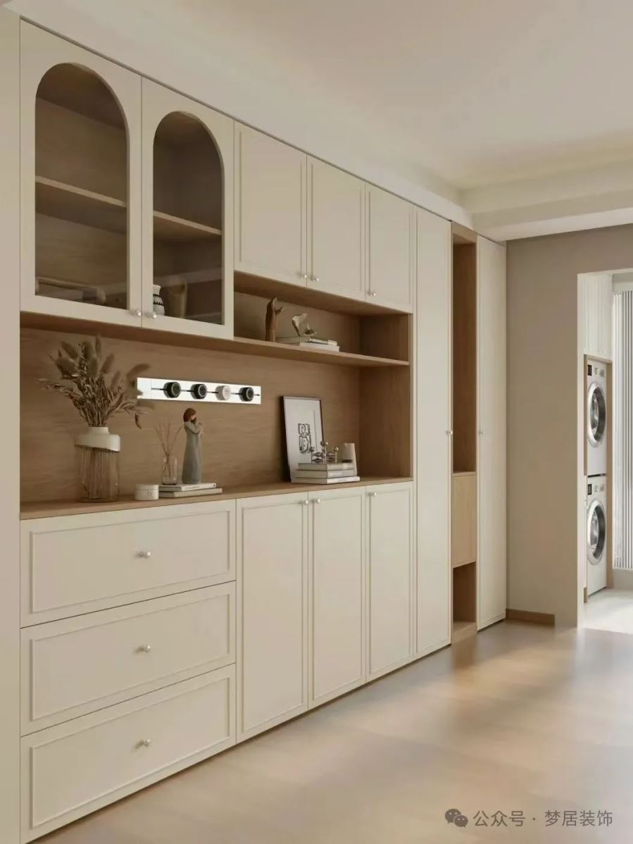 以淺色為主,適當(dāng)加一點(diǎn)原木色,做啞光免拉手柜門,簡單高級(jí),不要高光柜門,柜子可以加一點(diǎn)弧形設(shè)計(jì)更有氛圍。