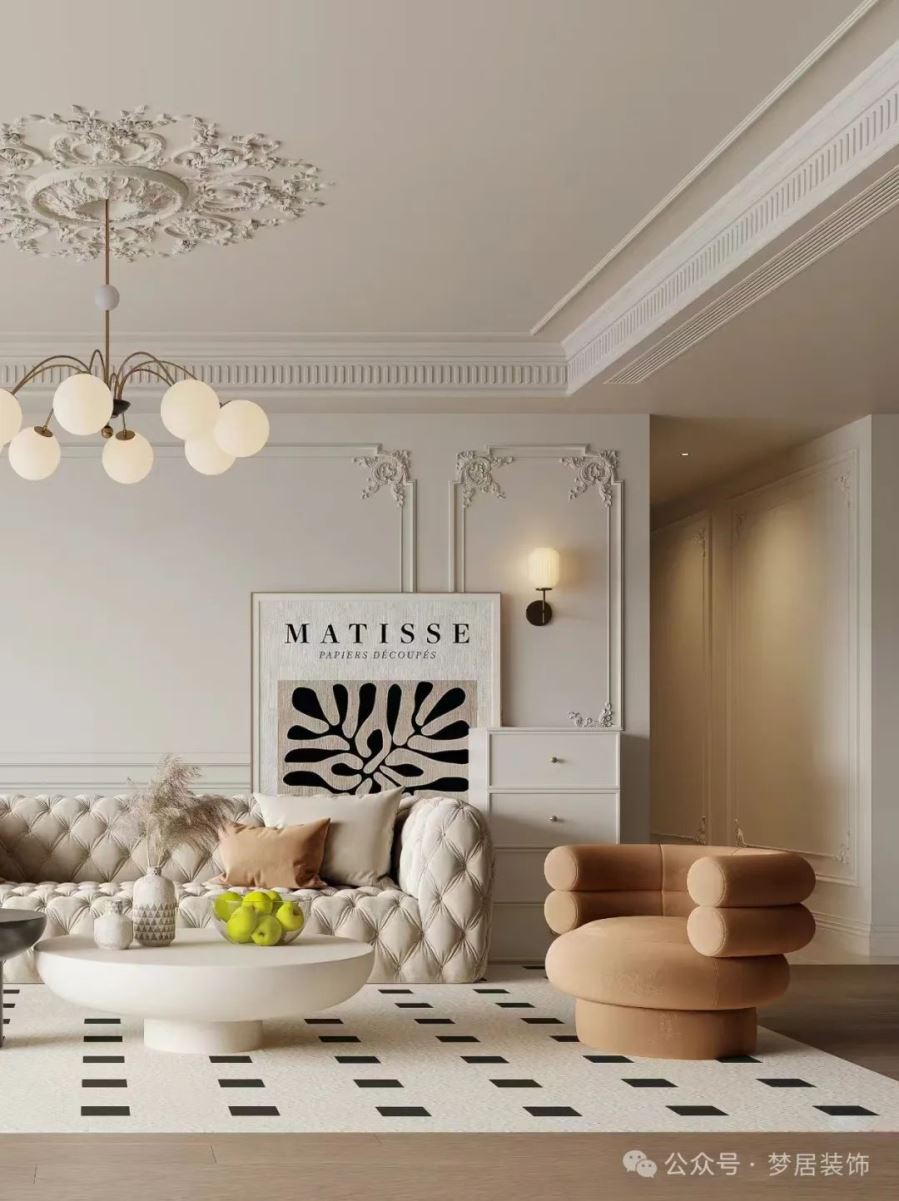 這是法式風(fēng)格不可缺少的元素。雕花燈盤、墻面線框是使法式風(fēng)格和其他風(fēng)格有一個(gè)明顯區(qū)別的主要元素。