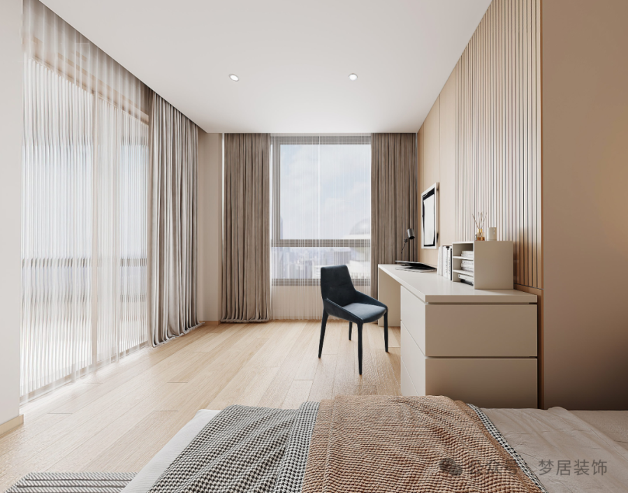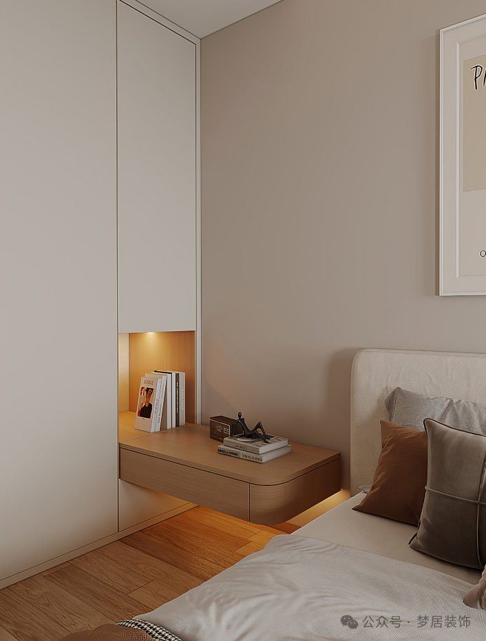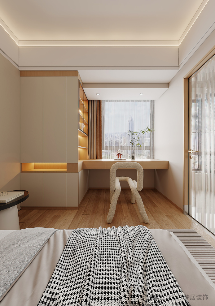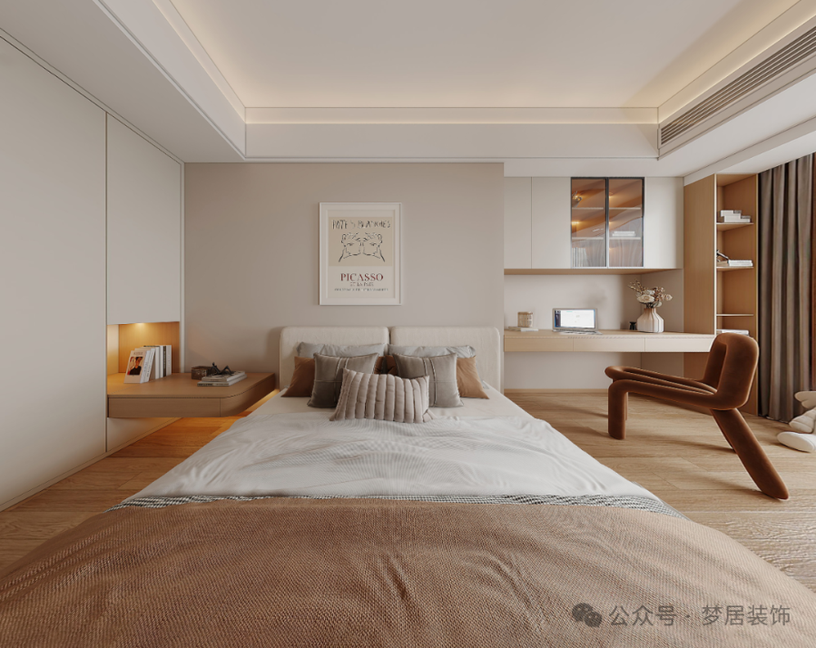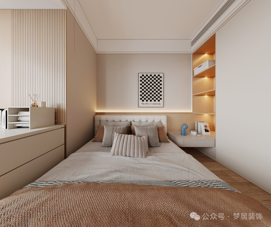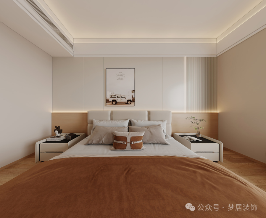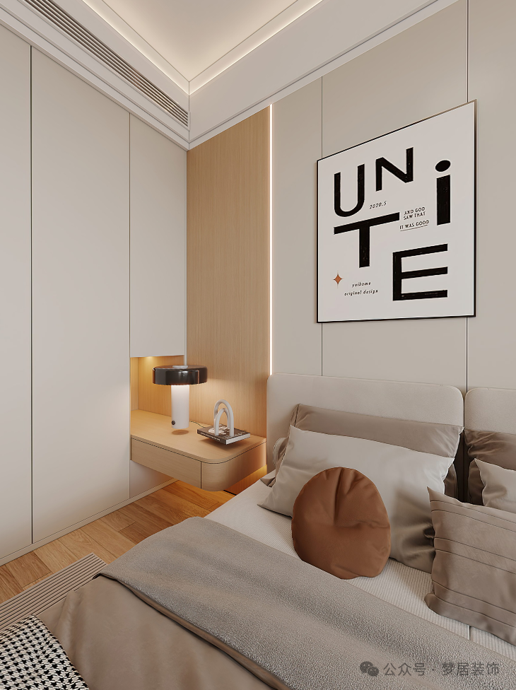 臥室以原木和淺杏為主,簡約的設計提升舒適度,呈現現代空間的溫馨舒適。床頭背景墻則采用硬包+木飾面板形成拼接設計,讓空間層次感更強。
