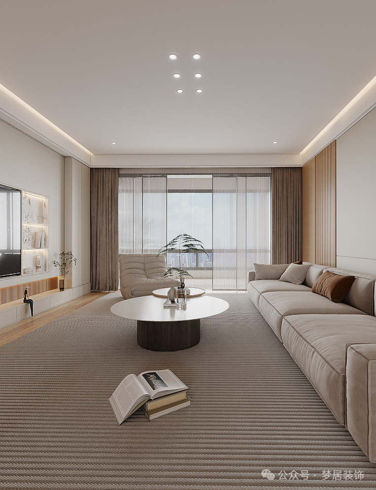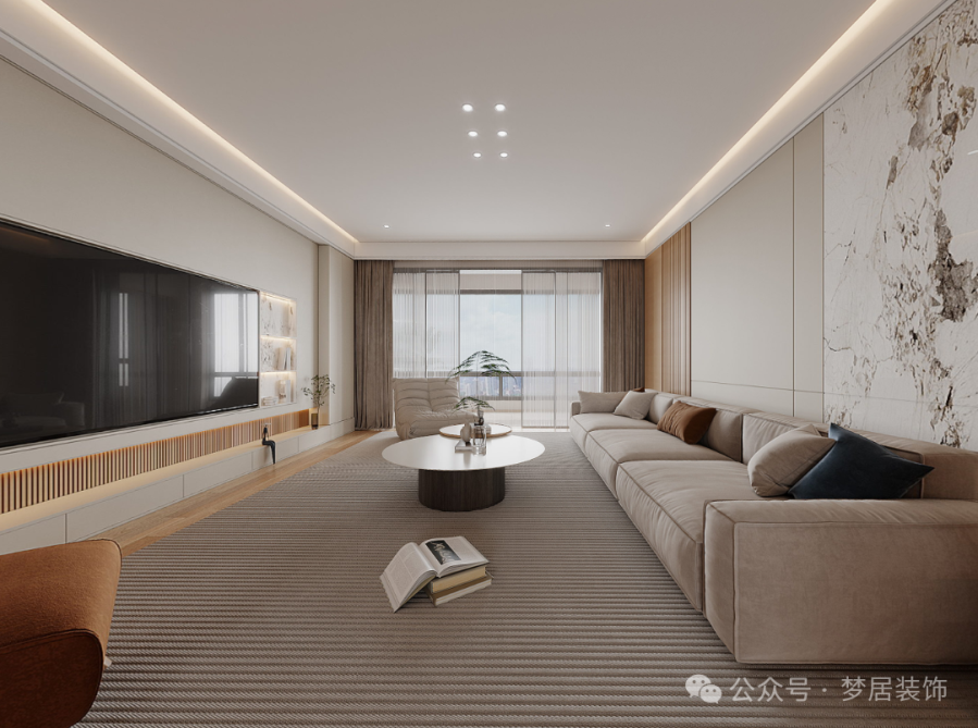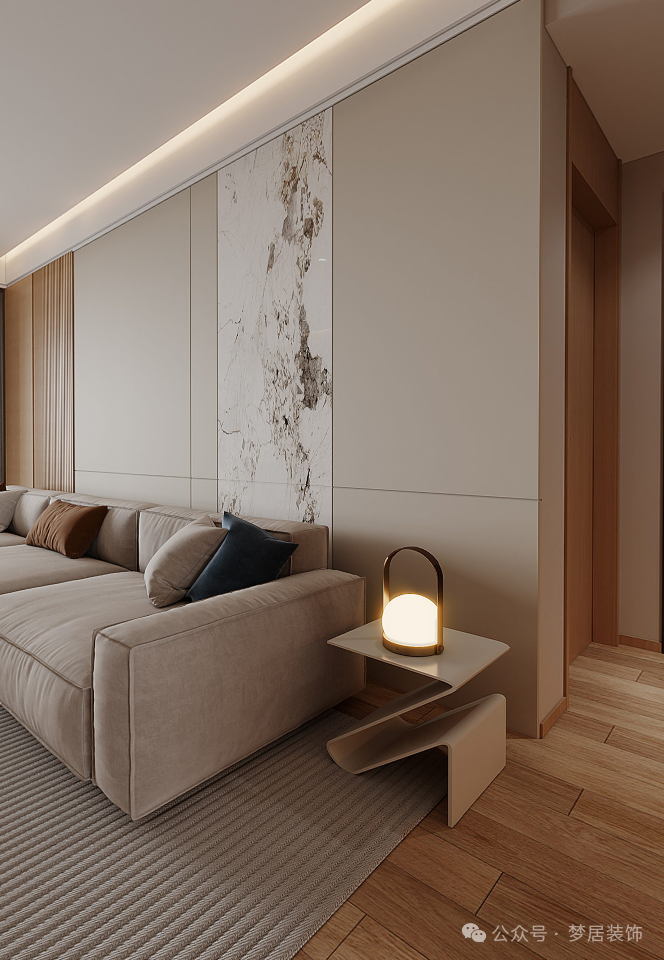 無主燈的設計和懸浮吊頂的融合延展視覺空間,讓客廳看起來更簡潔,暖色燈帶與原木色營造充足的氛圍感,層次感十足。