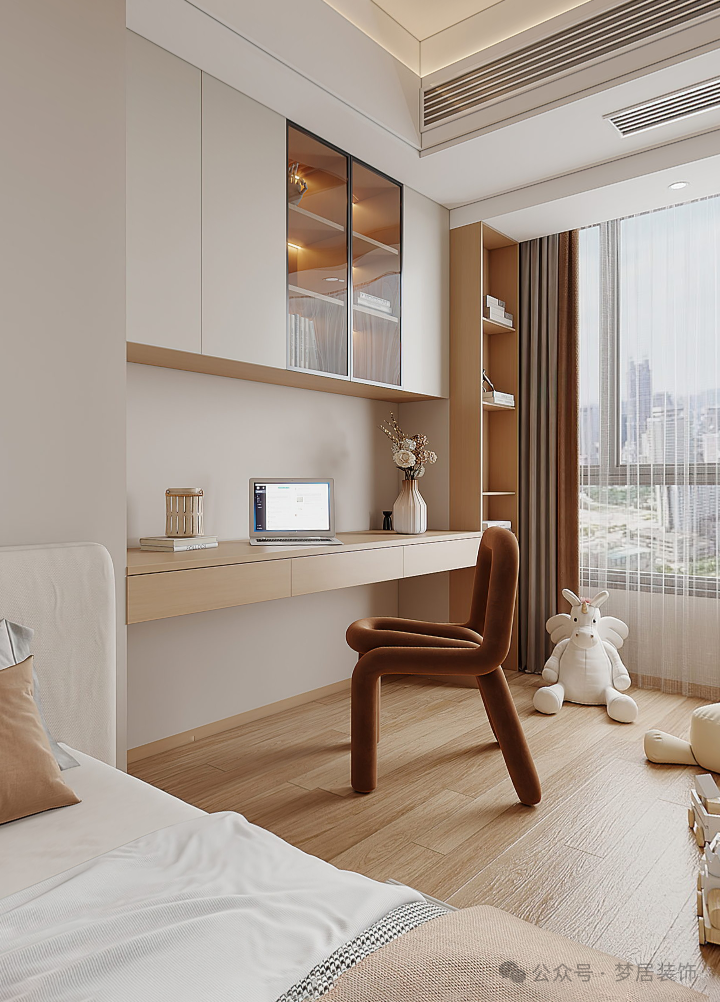 兒童房淺灰的床品與空間原木造型形成視覺對比,讓室內空間不再單調。定制柜延伸出一塊取代傳統(tǒng)床頭柜,清潔收納更方便。