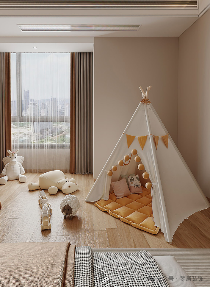 兒童房通鋪木地板腳感舒適,在孩子玩耍時能夠提供一定的緩沖。原木色為基調的兒童房自然、溫暖,舒適的色彩搭配為孩子帶來良好的情緒和休息。