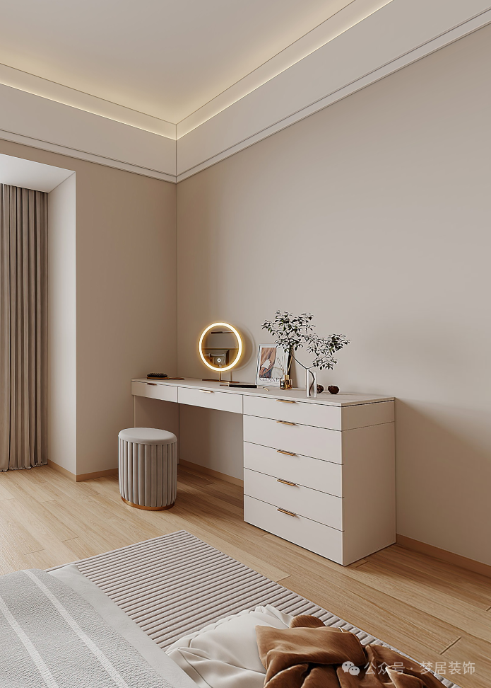 衣柜一側定制斗柜,滿足女主人梳妝需求。雙眼皮吊頂簡約高級,增加設計感。
