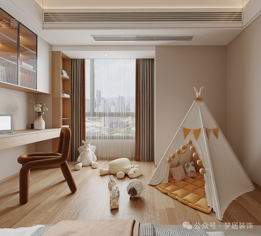 可愛的掛畫、玩偶,增加房間的自然感和趣味性,增加空間的質感和氛圍。既能起到裝飾作用,又能激發(fā)孩子的想象與熱愛。設置的開放式格子與收納柜,既方便孩子拿取物品,又使房間整潔有序。