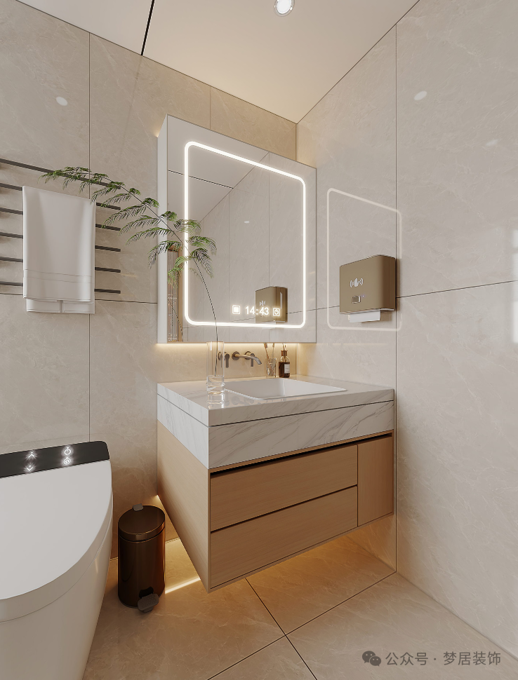 衛(wèi)浴空間布局干濕分離,方便日常的使用。空間采光較好,墻面、地面統(tǒng)一采用淺色瓷磚空間更透亮。懸空的原木浴室柜和可收納的浴室鏡柜確保收納更整潔,墻面預留壁龕滿足洗浴用品存儲需求。