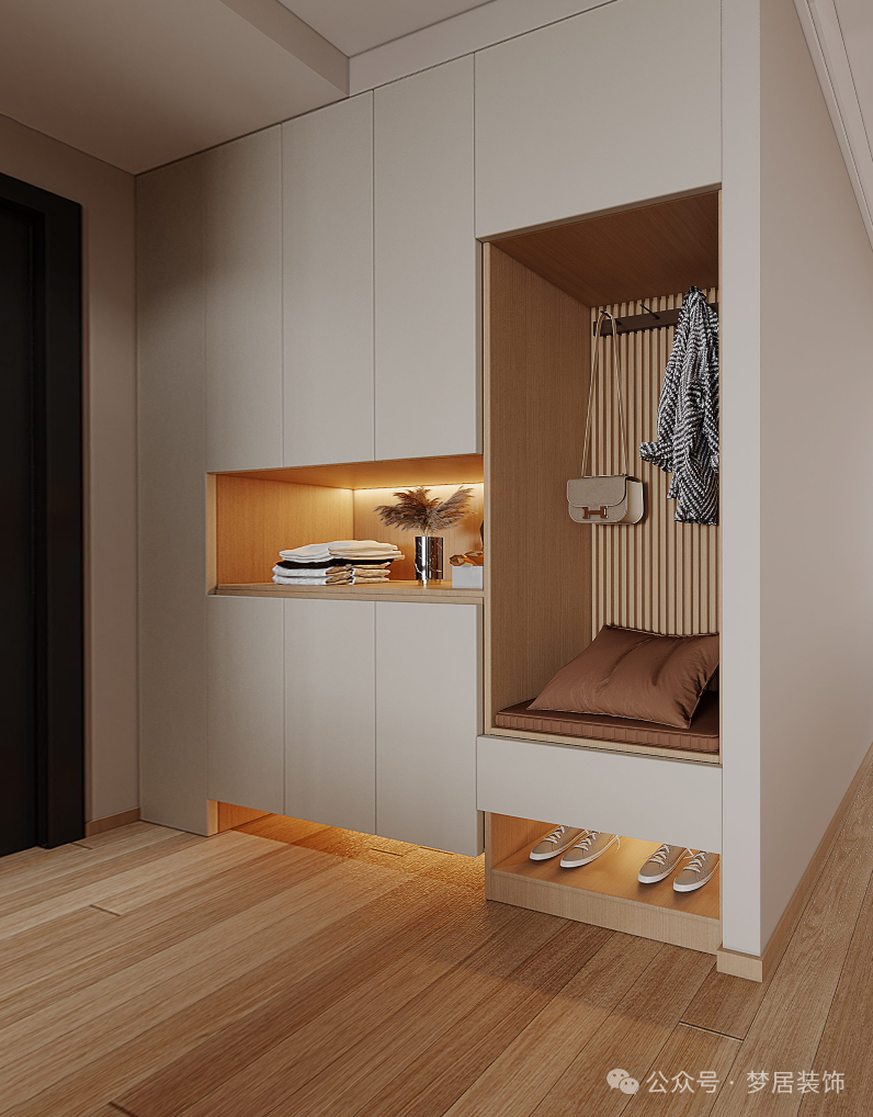 進門設計通頂柜,一側預留懸空的換鞋凳,搭配燈帶,淺色的柜門面板與溫潤的原木柜體形成強烈的視覺感,打造與眾不同的收納空間。