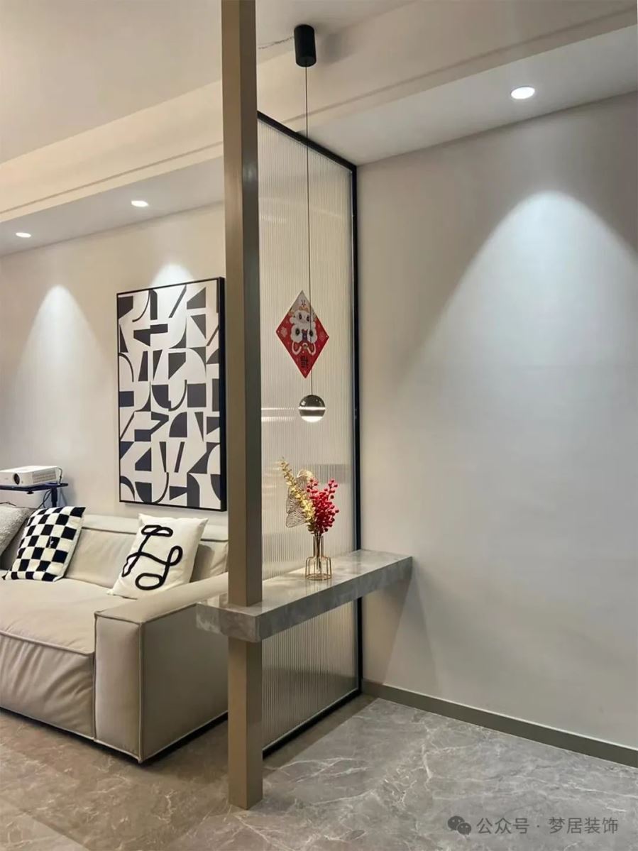 當開門直接對著客餐廳時,隱私問題便凸顯出來。為防止一打開門就把室內(nèi)空間全部看到,首先隔斷是個絕佳的選擇。