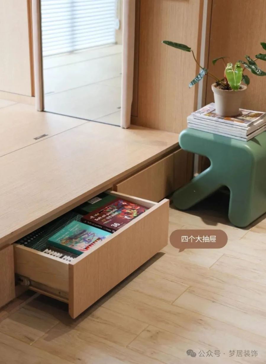 用來放一些抱枕書籍雜物,儲(chǔ)物功能會(huì)很強(qiáng)大,平時(shí)在這看書、鍛煉、會(huì)客、甚至有需要的時(shí)候還能當(dāng)客房使用。