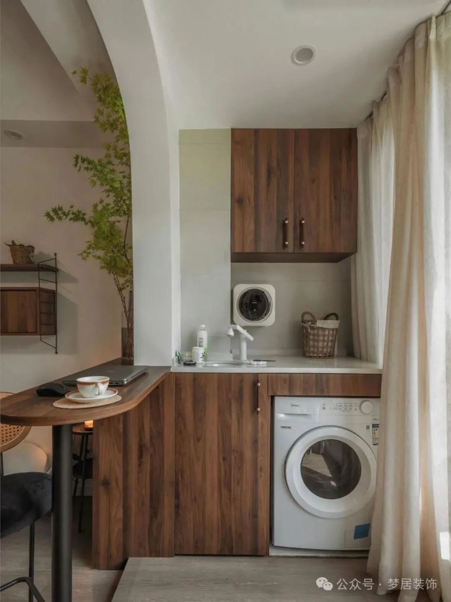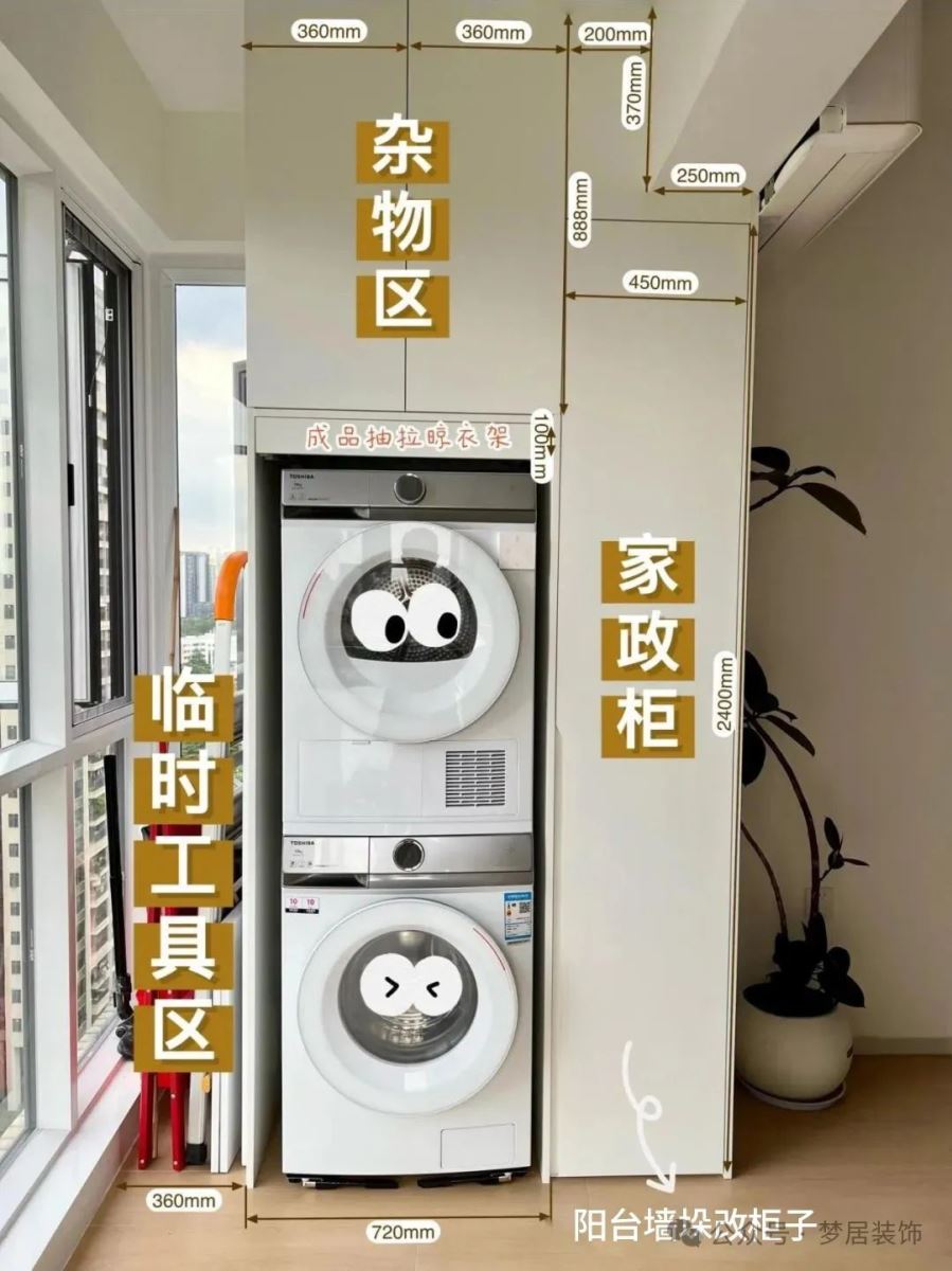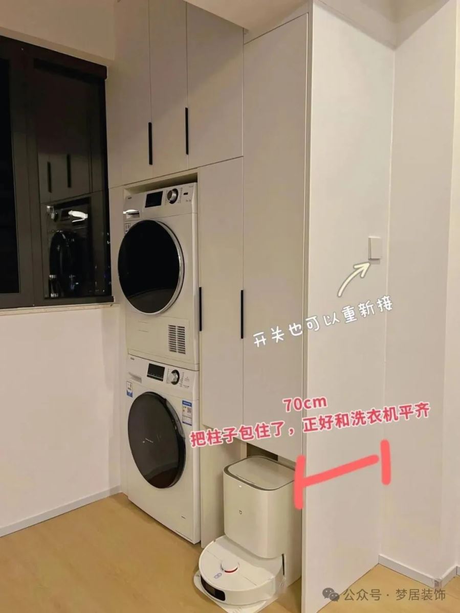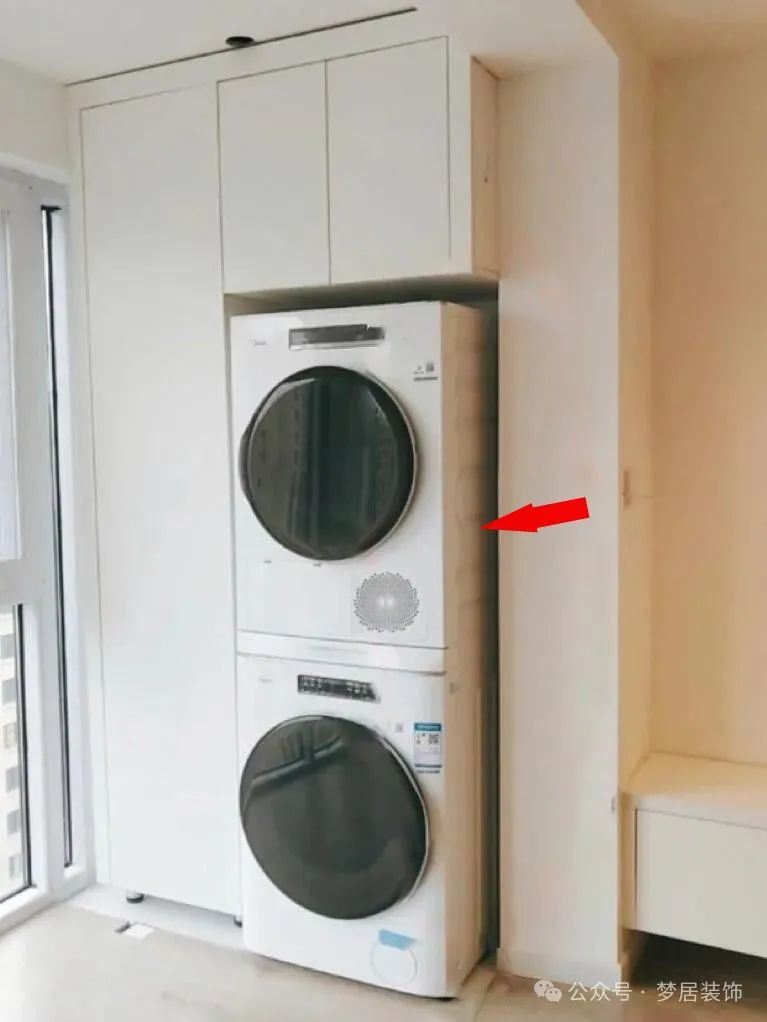 如果墻垛較窄的情況下,洗衣機(jī)、烘干機(jī)等設(shè)備嵌入柜子可能會(huì)凸出部分機(jī)體。