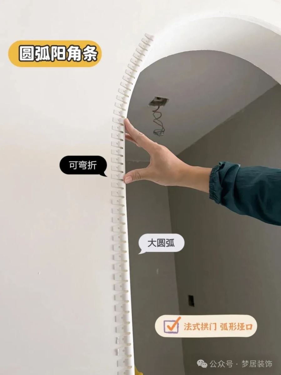 用石膏板做兩個(gè)圓弧角,注意邊角和墻面貼平,陽角掛上圓弧角條,用石膏填蓋住,露出圓弧部分,打磨光滑,刷上乳膠漆就完成了。