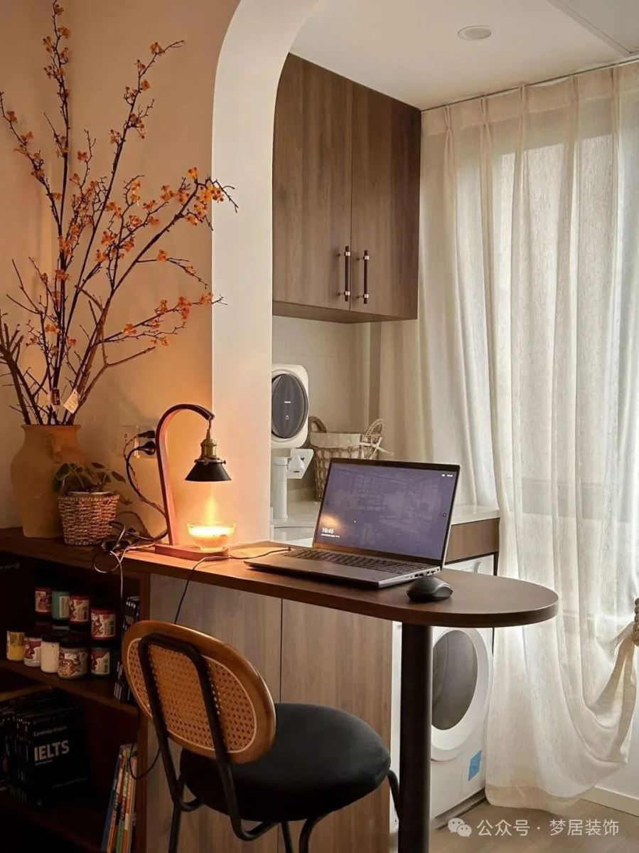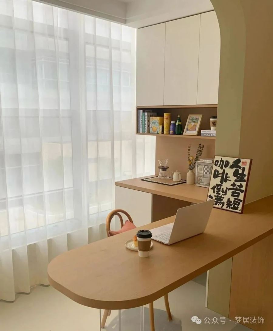 臺(tái)面一邊齊平墻垛,一邊延伸至墻面,臺(tái)面一短一長(zhǎng)更有層次感。桌子的邊角可以選擇弧形設(shè)計(jì),讓空間更舒適流暢。