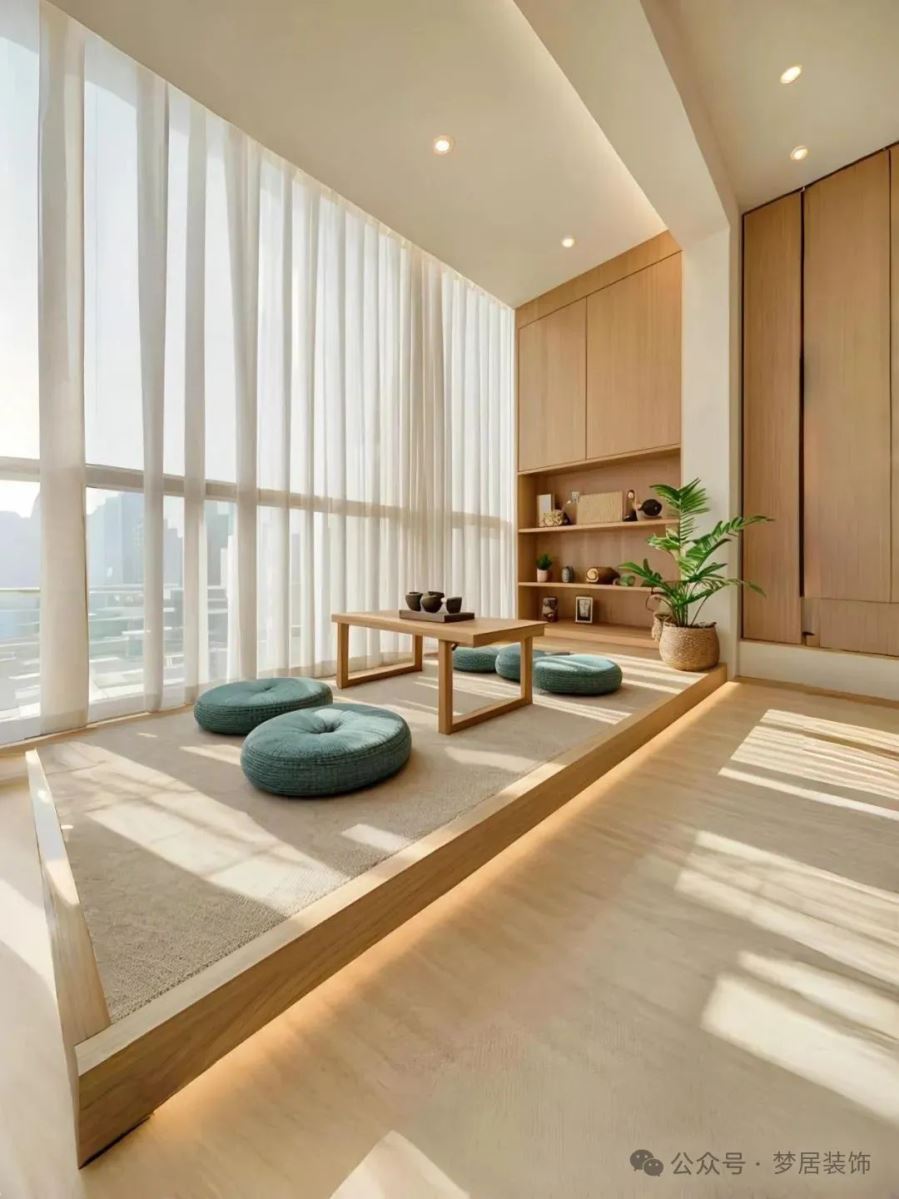 劃分出的地臺(tái)空間感更強(qiáng),地臺(tái)擺上茶幾,蒲墊,可以是席地而坐的飲茶區(qū),它還可兼具閱讀區(qū)、休閑區(qū)、會(huì)客區(qū)、健身區(qū)、兒童活動(dòng)區(qū)等等功能。