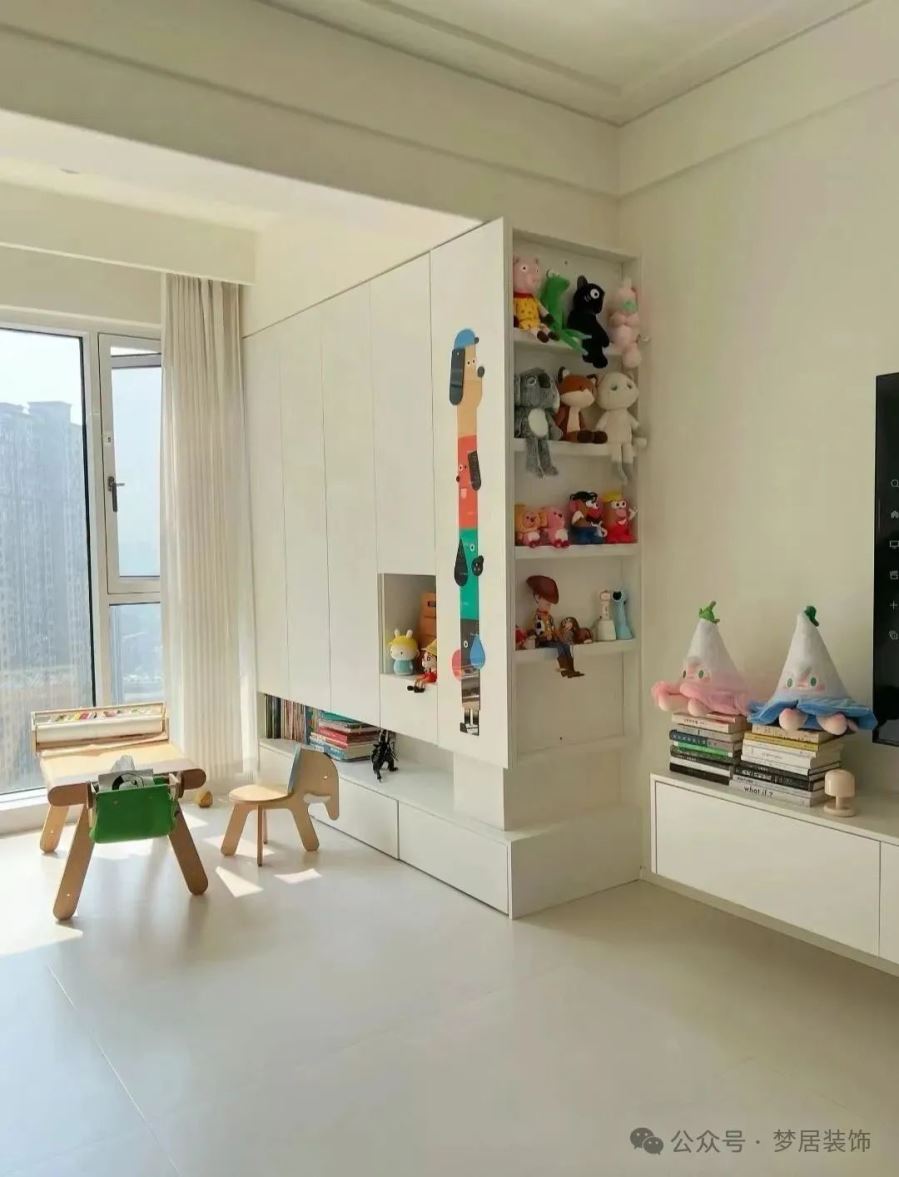 或者在墻垛處面向客廳這邊做一個(gè)超薄的展示柜,放孩子喜歡的小玩具,簡(jiǎn)單,好看,實(shí)用。