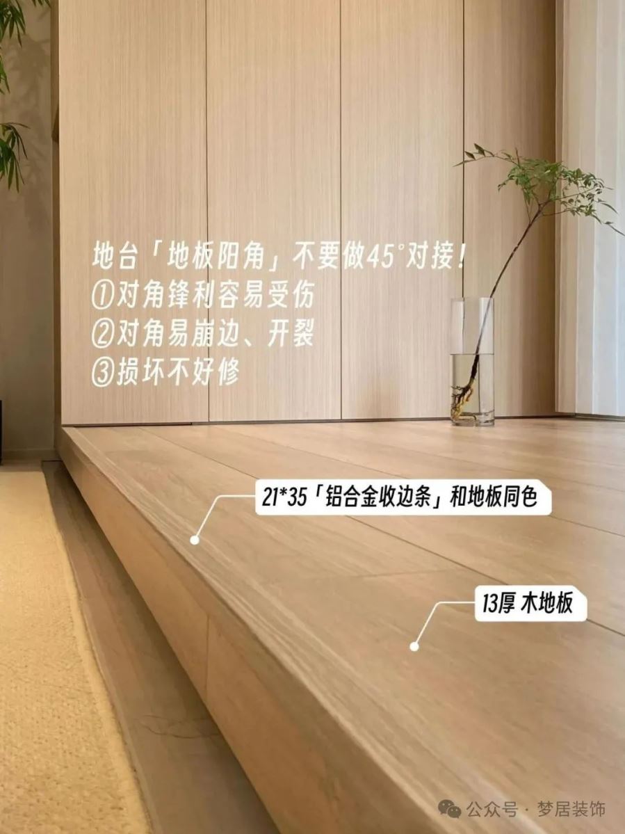 做地臺(tái)提前預(yù)留好電路,裝上燈帶更有氛圍。地臺(tái)陽角建議做90°對(duì)接收邊,這樣不會(huì)容易崩邊開裂。