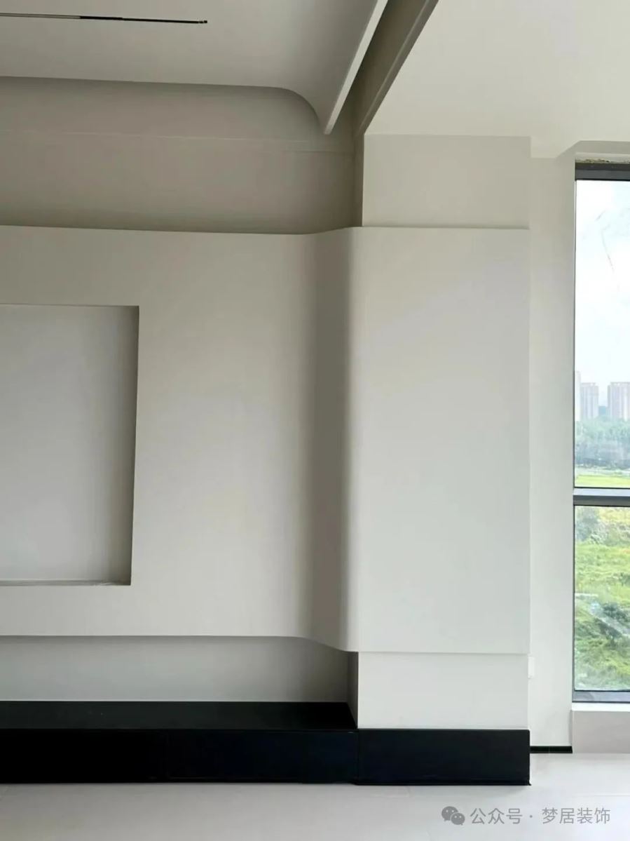 用石膏板把墻垛包裹住,做弧形造型、波浪輪廓,和電視背景墻一體銜接。