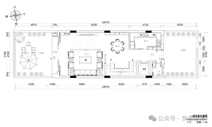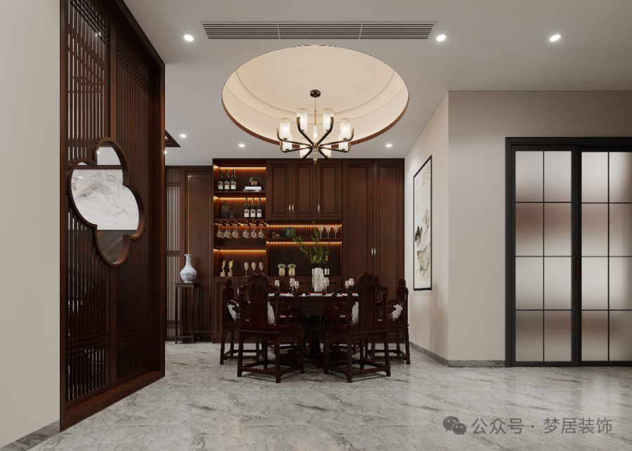 整個一層的設(shè)計是將客餐廚的功能都囊括在內(nèi),客廳旁就是餐廳。圓形吊頂與傳統(tǒng)圓桌的搭配,有著團圓美滿的寓意;深棕色整體定制酒柜內(nèi)置燈帶,陳列美酒與擺件,實用美觀。一扇中式屏風(fēng)巧妙隔斷,透過梅花框?qū)?nèi)外景色交融,增強了空間的層次感和深度感。