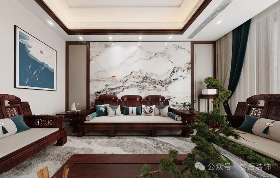 客廳對稱式設(shè)計,搭配水墨紋大理石沙發(fā)背景墻,莊重典雅。整個空間似山水畫卷,成為視覺焦點。實木沙發(fā)雕花繁復(fù)精致,細節(jié)處盡顯傳統(tǒng)工藝魅力。藍綠色抱枕和墻面畫作與空間色彩形成鮮明而和諧的對比,空間自然靈動。