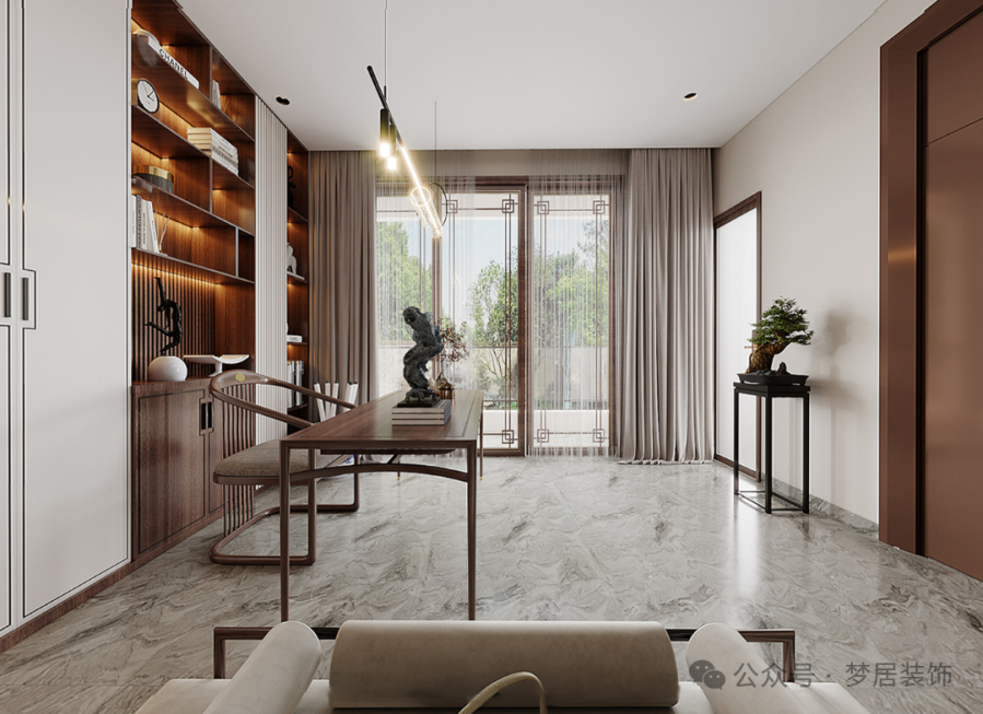 二樓靠近露臺設(shè)置了開放式書房,簡約的新中式書桌椅雅致大氣,一面到頂?shù)臅裰糜跁篮竺妫斕炝⒌氐脑O(shè)計最大化利用空間,收納書籍、文件,平時可在這里閱讀辦公,搭配一旁的盆景綠植,寧靜中蘊含生機。