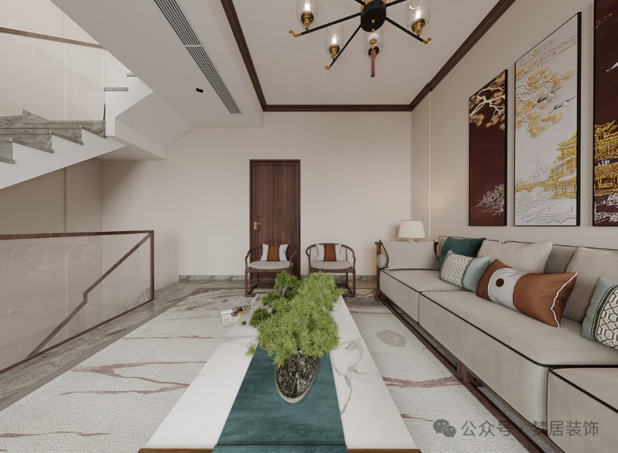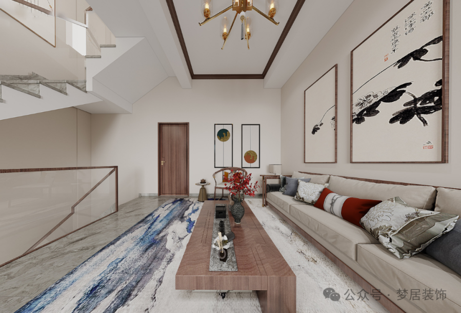 二樓休閑廳將傳統(tǒng)元素與現(xiàn)代舒適融合,彰顯中式美學(xué)的典雅。米色墻面搭配深棕木質(zhì)元素,營造出溫暖寧靜的氛圍;墻面三幅畫作,金色線條勾勒出傳統(tǒng)山水、樓閣,金屬光澤增添華麗質(zhì)感,成為空間的視覺焦點。