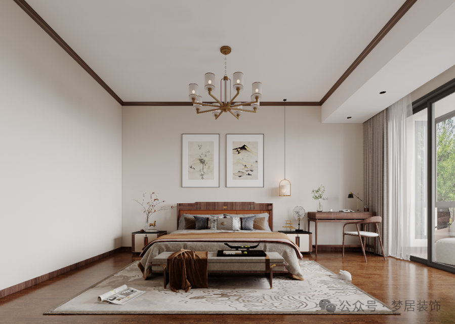 男孩房設(shè)計干凈清爽,氛圍寧靜舒適。淺米色墻面搭配木質(zhì)踢腳線與天花裝飾線條,勾勒空間輪廓,溫潤自然。實木家具線條利落,搭配新中式床頭柜,沉穩(wěn)大氣。大面積落地窗引入自然光。