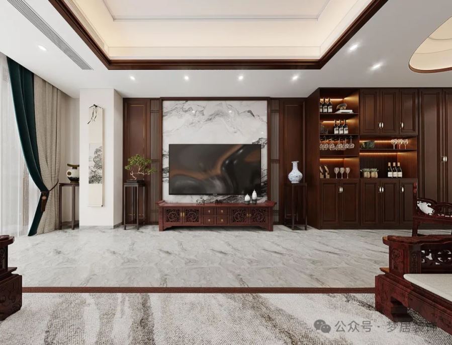 一樓客廳盡顯傳統(tǒng)中式之美。大理石電視背景墻與兩側(cè)深色木飾面搭配,大氣典雅。兩側(cè)花架搭配青花瓷、綠植與畫作,韻味十足。多層次吊頂設(shè)計,輔以筒燈照明,光線傾灑而下,空間明亮大氣 。