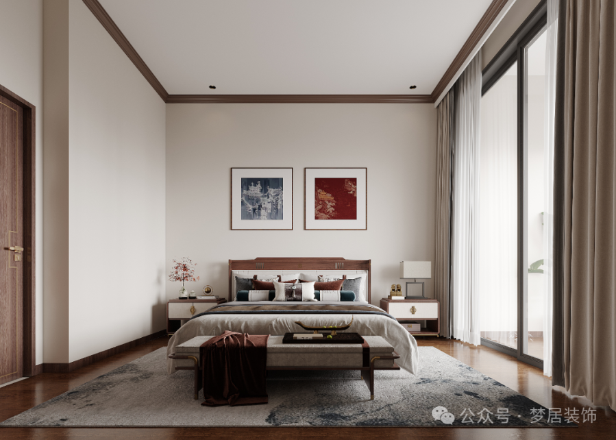 主臥劃分出睡眠區(qū)、衣帽間及套衛(wèi),還有一個休閑陽臺。臥室實木大床典雅舒適,兩側(cè)對稱置放床頭柜,墻面搭配中式山水、花鳥工筆畫,繁花似錦、鳥啼婉轉(zhuǎn),將春日盛景引入夢境。清晨陽光灑入陽臺和室內(nèi),開啟悠然一天。